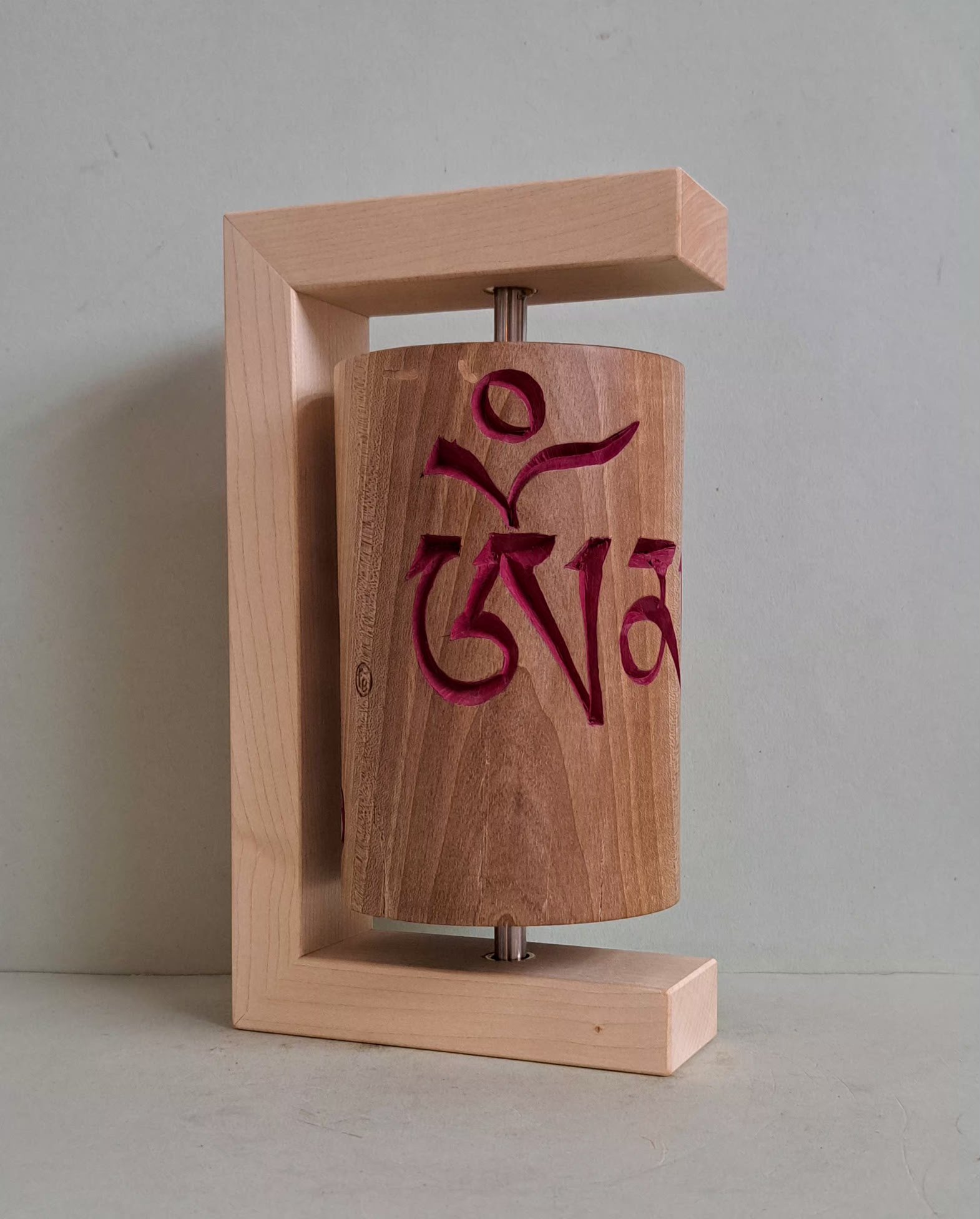 Diese Gebetsmühle ist ein handgefrtigtes Einzelstück. Das Holz gibt es in dieser Erscheinung nur einmal. Die Holzhalterung wird mit zwei Schrauben an der Wand befestigt.